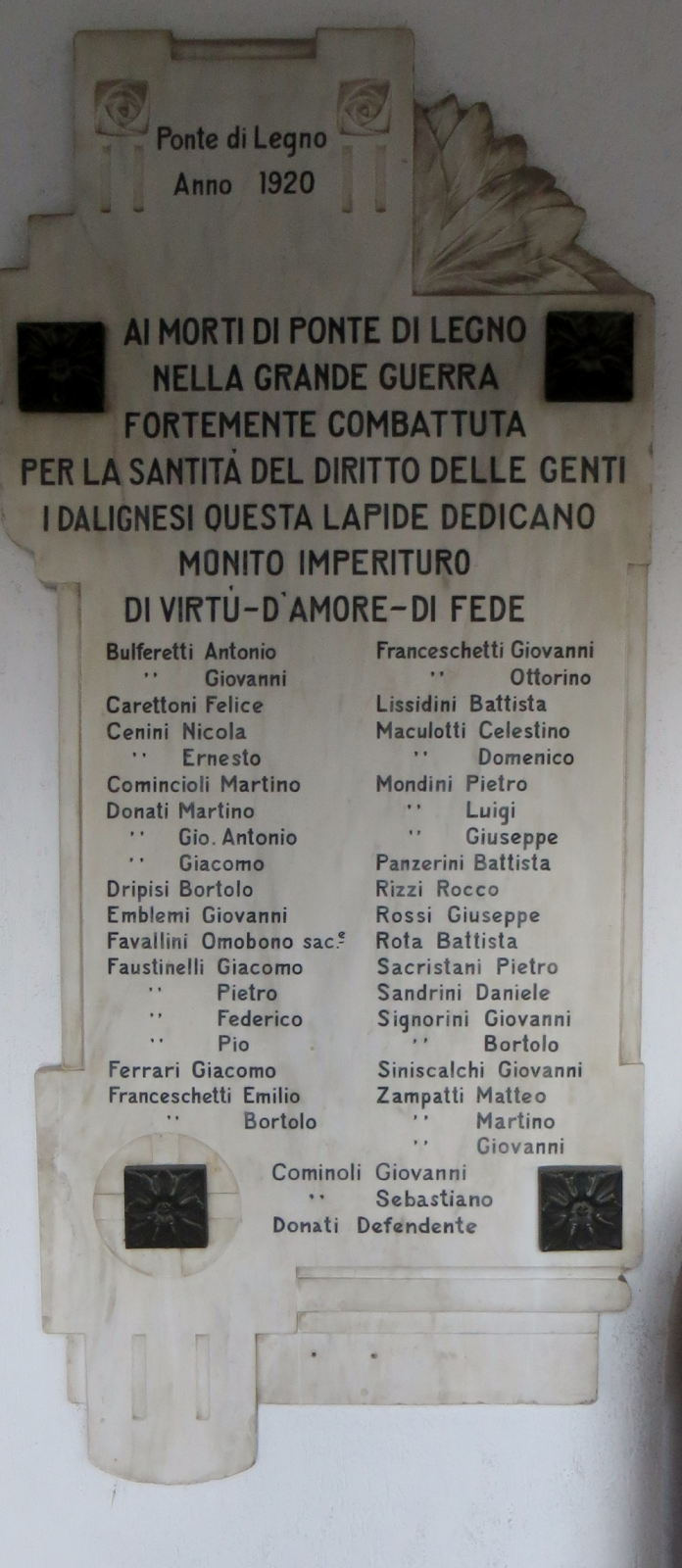 La nostra classe terza A, invece ha rivolto la propria attenzione alla lapide (Inizialmente era posta nella precedente sede del Comune che era situato a nord della piazza XXVII Settembre), posta all’ingresso del Municipio, che ricorda i caduti dalignesi durante la I Guerra Mondiale. È in marmo bianco, risale al 1920 e riporta una frase che ci testimonia un forte sentimento patriottico: “Ai morti di Ponte di Legno nella Grande Guerra combattuta per la santità del diritto delle genti i Dalignesi questa lapide dedicano monito imperituro di virtù d’amore di fede”. Il monumento, realizzato su progetto dell’ingegner Moscatelli, capo dell’ufficio tecnico del Ministero per le Terre Liberate, fu inaugurato il 31 luglio 1921.